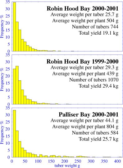 When the kumara were harvested, we bagged all tubers according to their mound, and later weighed each tuber to 1 g precision, and kept records by plant and mound.