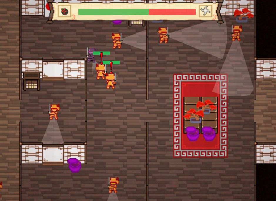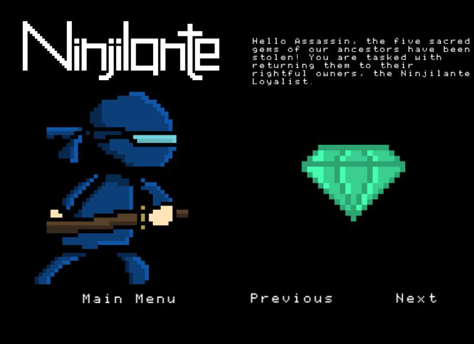 Ninjilante is a 2D stealth action game in which you control two competing ninjas that steal and kill their way towards a common objective. The player must stealthily navigate through large amounts of enemies by avoiding their cones of vision, to steal priceless gems. Ninjilante will have a top-down oblique camera view, and detailed pixelly graphics to give it a semi-retro aesthetic.